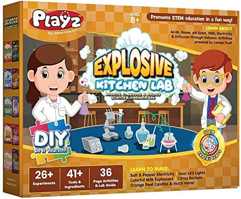 Playz Explosive Kitchen Lab 26 Physics Chemistry Biology Science Experiments Set Make Salt Pepper Electricity Sour Led Lights Colorful Milk Explosions Citrus Rockets Orange Peel Candles Learning Education